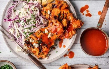 Buffalo Chicken Thighs on the Grill with Blue Cheese Slaw