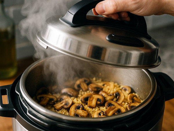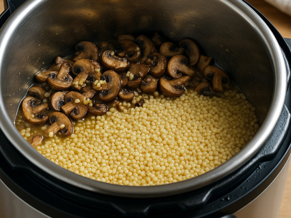 When the cooking time is up, carefully release the pressure using the quick-release method. Once it’s safe, open the lid and fluff the couscous with a fork. Add the sliced mushrooms, then switch back to sauté mode and stir everything together for a few minutes—just long enough to warm the mushrooms without making them soggy.