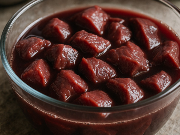 Put the venison in a big bowl and mixing in the red wine, a teaspoon of salt, and some black pepper. Let it sit and soak up those flavors for about 10 minutes. When the venison is ready, take it out and set the marinade aside.