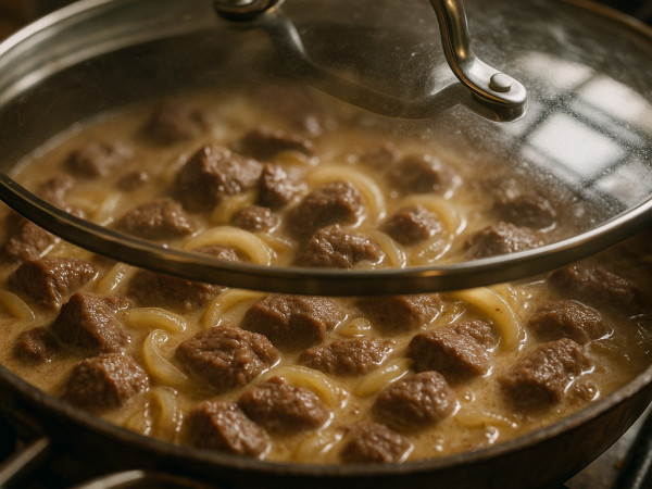 Add the venison and onion mixture back into the skillet. Cover everything and let it simmer gently, giving it a stir every 20 minutes or so, until the venison is tender—it should take between 1 and 2 hours.