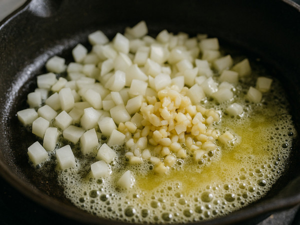 Melt a couple of tablespoons of butter in the same skillet. Toss in the chopped onion with a pinch of salt and cook until it softens, about 5 minutes. Add the garlic and cook for a few more minutes until everything is fragrant and translucent. Scoop this onion and garlic mix onto the plate with the venison.