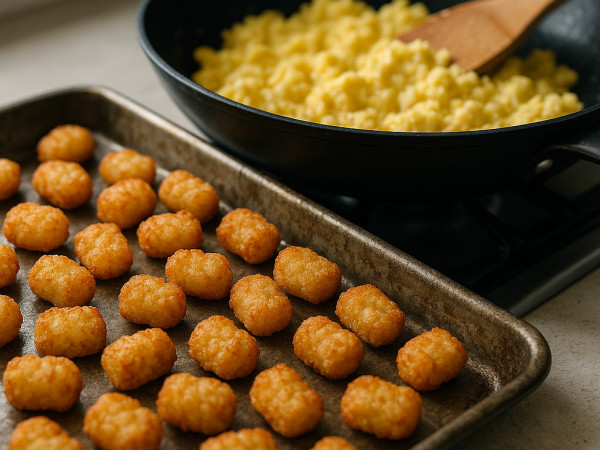 Heat your oven to 450°F. Spread the potato nuggets out in a single layer on a baking sheet and pop them in the oven. They'll take about 17 to 19 minutes to get nice and golden. While the potatoes are cooking, spray a large skillet with cooking spray and warm it over medium-high heat. Crack the eggs into a bowl and whisk them up, then pour them into the skillet. Stir occasionally until the eggs are fully cooked, which should take around 5 minutes.