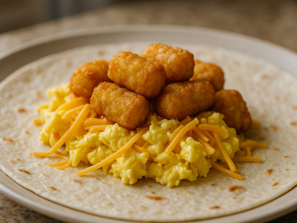 To assemble, lay out a tortilla on a microwave-safe plate and place two slices of Cheddar cheese down the center. Spoon a quarter of the scrambled eggs over the cheese, then add around five potato nuggets. Microwave this for about 20 seconds until everything is warmed through. Pour some of the gravy over the filling and microwave for another 20 to 30 seconds. While it’s still warm, roll up the tortilla tightly around the filling. Repeat this process to make three more burritos with the rest of your ingredients. Enjoy!