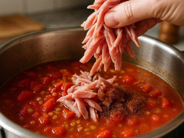 While the soup is still warm, shred the cooled ham meat off the bones and stir it back into the pot along with the tomatoes, a pinch of black pepper, and a splash of vinegar. Let everything simmer gently just until heated through, then it’s ready to enjoy.