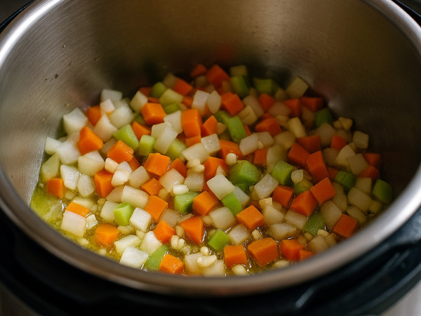 Heat some olive oil in the empty pressure cooker over medium heat. Add the chopped onion, carrots, celery, and garlic, cooking and stirring gently until everything softens and the veggies start to shrink down, which should take around 20 minutes.