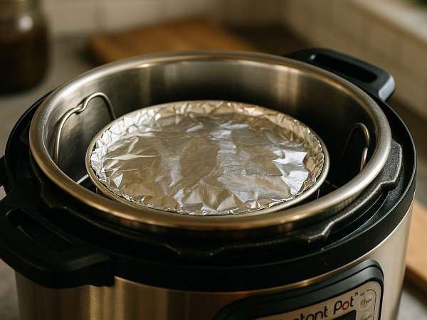Pour the batter into your prepared pan and cover it tightly with foil. Place the pan on the trivet inside the Instant Pot. Seal the lid and set the cooker to high pressure for 30 minutes. It will take about 10 to 15 minutes to come up to pressure.