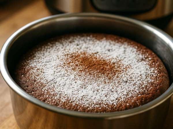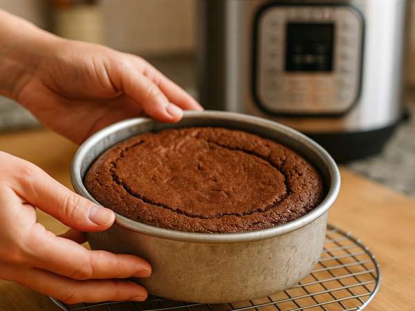 When the cooking time is up, let the pressure release naturally for about 15 minutes before opening the lid. Carefully lift the cake out using tongs and set it on a wire rack to cool for 15 minutes. To remove the cake from the pan, place a plate on top, flip it over, then flip it again onto another plate so it’s right side up.