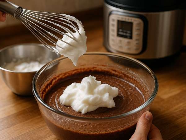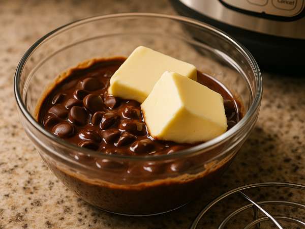 Pour 2 cups of water into your Instant Pot and placing the trivet inside. Grease an 8-inch round cake pan generously with butter. In a large microwave-safe bowl, combine the chocolate and butter. Microwave it for 2 minutes at 800 watts, then give it a good whisk. Pop it back in the microwave for another 2 minutes, whisk again, and keep microwaving and stirring in short bursts until everything is completely melted and smooth.