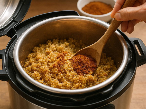 Once the cooking time is up, carefully release the pressure using the quick-release method, then open the lid. Scoop the quinoa into a large bowl and stir in the salsa, nutritional yeast, cumin, chili powder, garlic powder, salt, and pepper until everything is well combined.