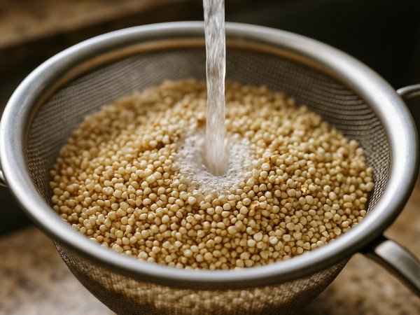 Giv the quinoa a good rinse in a fine mesh strainer to get rid of any bitterness. Pour the rinsed quinoa and water into your Instant Pot or any similar pressure cooker, then stir in the vegetable bouillon. Seal the lid and set it to cook on high pressure for 10 minutes. It will take about 10 to 15 minutes for the pressure to build up before the cooking starts.