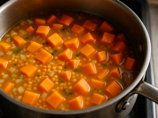 Warm some olive oil in a pot over medium-low heat. Toss in the chopped onion and let it cook gently until it becomes soft and translucent, which should take about 5 minutes. Next, add the sweet potatoes, carrots, minced garlic, garam masala, seasoned salt, cayenne, regular salt, and pepper. Stir everything together and let it cook for another 5 minutes so the spices can get to know the veggies. Pour in the broth and water, then bring the mixture up to a boil. Let it cook for around 10 minutes to let the flavors meld. After that, add the spinach and lentils, bring it back to a boil, then lower the heat and let it simmer gently until the lentils are tender, about 15 to 20 minutes.