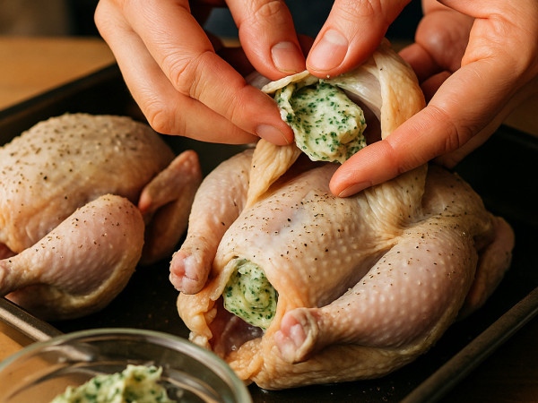 In a small bowl, mix the butter with a teaspoon of Italian seasoning until well combined. Rinse the Cornish hens inside and out under cool water, then pat them dry with paper towels. Season the cavity with salt and pepper, and gently loosen the skin from the breast meat to create a pocket—be careful not to tear it. Divide the butter mixture between the hens, spreading it under the skin.