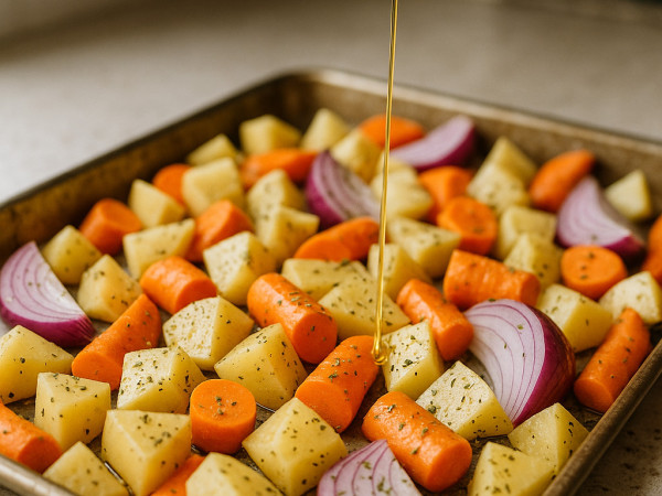 Warm your oven to 500°F (260°C) and lightly spray a large sheet pan with cooking spray. Spread out the potatoes, carrots, and onions in a single layer on the pan. Drizzle everything with olive oil and sprinkle about a tablespoon of Italian seasoning over the veggies.