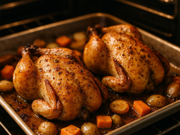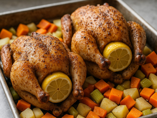 - Arrange the vegetables evenly around the hens to ensure everything cooks at the same rate.