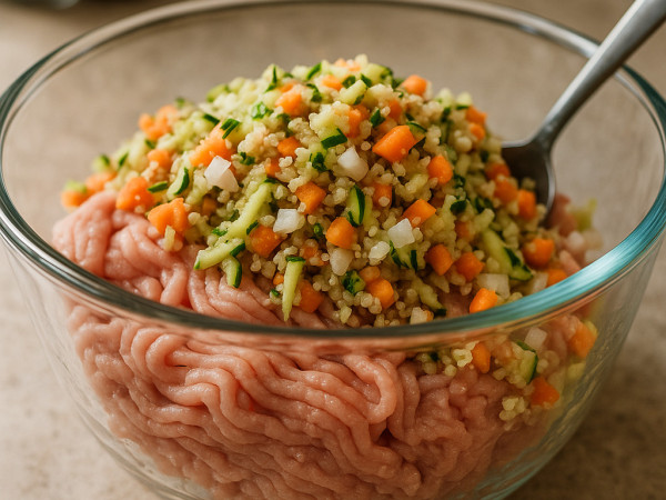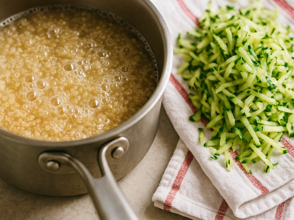 Bring some water and the quinoa to a boil in a saucepan. Once it’s boiling, turn the heat down to medium-low, cover it, and let it simmer gently until the quinoa is tender, about 15 to 20 minutes. While that’s cooking, grate the zucchini using a cheese grater right over a clean kitchen towel. Then wrap it up and squeeze out as much moisture as you can—that step helps keep the meatloaves from getting soggy.