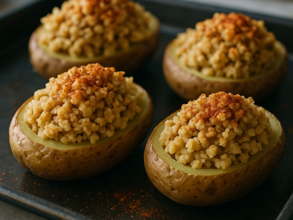 Spoon the filling back into the potato skins, piling it up generously. Sprinkle a little paprika on top for color and extra flavor. Bake the stuffed potatoes for about 30 minutes, until the tops are lightly browned and everything is heated through. Enjoy!