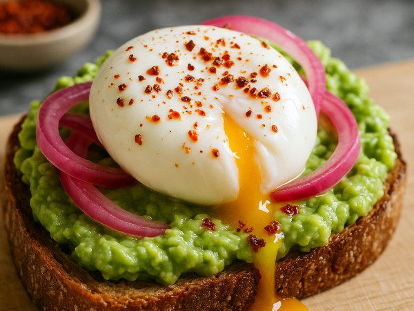 Toast your bread to how you like it and spread the mashed avocado on top. Add a spoonful of the pickled shallots, then gently place the poached egg over everything. Finish with a sprinkle of Aleppo pepper, and enjoy it right away!