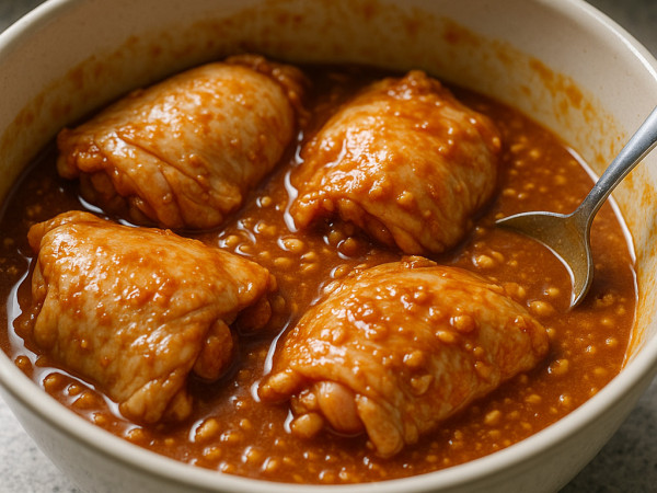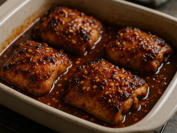 When you're ready to cook, preheat your oven to 375°F (190°C). Transfer the chicken thighs to an oven-safe dish and bake for about 35 to 45 minutes, until the meat is cooked through and the juices run clear. To be sure, check that an instant-read thermometer reads 165°F (74°C) near the bone. Let the chicken rest a few minutes before serving.