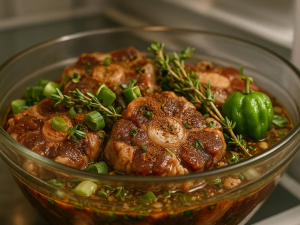Stir the oxtail with onion, thyme, browning sauce, scallions, red pepper flakes, ginger, allspice, garlic, and bay leaves in a large bowl. Cover it up and pop it in the fridge to marinate for at least 8 hours, or overnight if you have the time.
