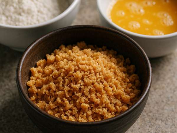 Warm your air fryer to 370°F (190°C). Crush the pork rinds in a food processor until they’re about the size of breadcrumbs, then transfer them to a shallow bowl. In another dish, mix together the flour and barbecue seasoning. In a third bowl, beat the egg until smooth.