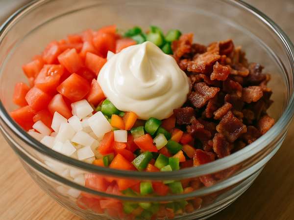 Chop the tomatoes into bite-sized pieces and dice the onion and green bell pepper. In a big bowl, combine the mayonnaise, cheeses, chopped vegetables, and the crumbled bacon. Give everything a good mix, then spoon this filling into your partially baked pie shell. Sprinkle a little extra crumbled bacon on top for some added crunch.