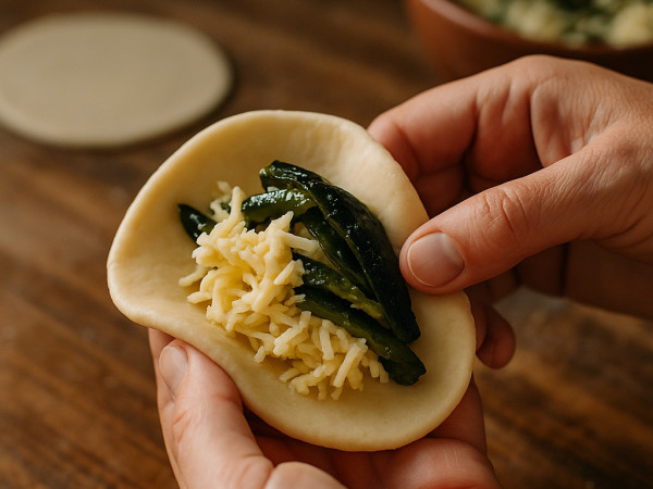 Spoon about 1 1/2 tablespoons of Manchego cheese onto each dough circle, then add a heaping 1/2 tablespoon of the roasted poblanos on top. Fold the dough over to cover the filling, wet your fingers with a bit of water and run them along the edges to help seal everything in, then press firmly to close.