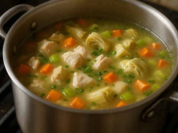 Warm the chicken broth and water in a large pot over medium-high heat. Squeeze in the lemon juice and give it a good stir, then let it cook for about 5 minutes. While that’s heating, heat some oil in a grill pan over medium-high heat. Toss in the red bell pepper and cook it until it softens a bit, around 3 to 5 minutes. Once it’s ready, add the pepper to the pot along with the tomatoes, artichokes, potato, carrot, celery, green onions, mushrooms, and garlic. Turn the heat up to high and bring everything to a boil. Let it simmer until the veggies are tender, which should take about 15 minutes. Then, stir in the cream and wine.