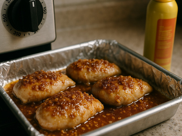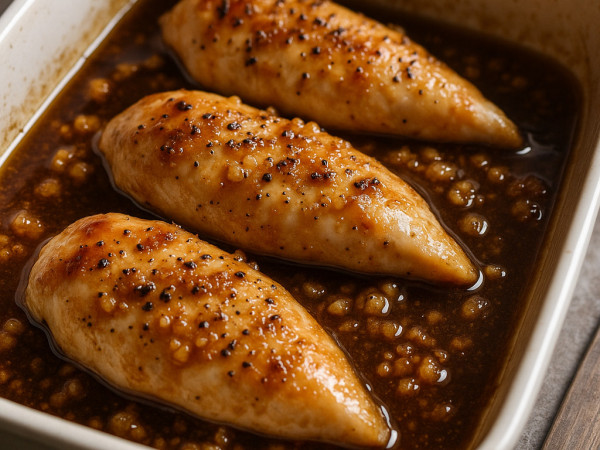 Place the chicken breasts in the baking dish and pour the brown sugar glaze over them. Sprinkle some black pepper on top for a little extra flavor.