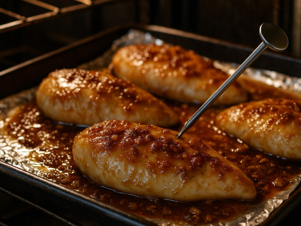 Pop the dish in the oven and bake until the chicken is cooked through and no longer pink inside, usually about 30 minutes. To be sure, check that the thickest part reads 165°F (74°C) with a meat thermometer. Let it rest a few minutes before serving.