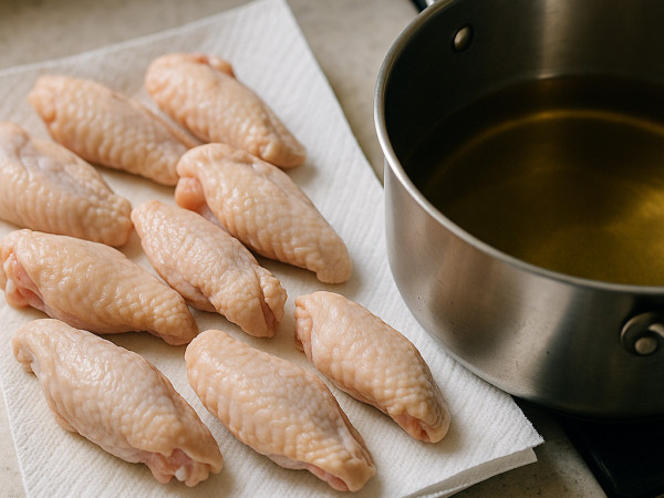Preheat your oven to 375°F and lightly spray a baking sheet with cooking spray. Next, heat some vegetable oil in a deep pot or fryer until it reaches 375°F. While the oil heats up, rinse your wings and pat them completely dry with paper towels. Fry the wings in batches of five or six for about 10 minutes, just until they’re partially cooked. Drain them on paper towels and let them cool down a bit.