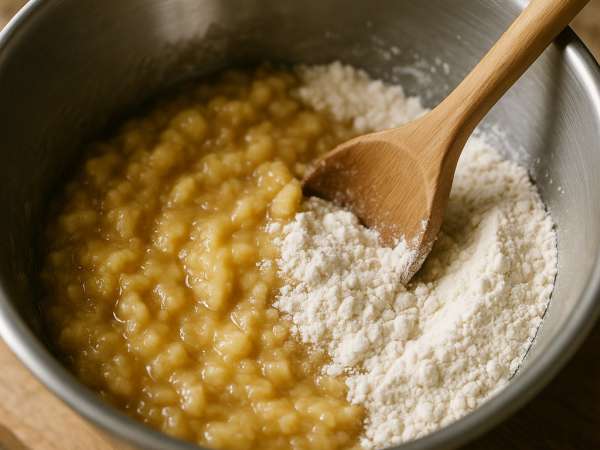 Lightly heat your oven to 350°F (175°C) and greasing a loaf pan so the bread doesn’t stick. In a medium bowl, whisk together the flour, baking powder, salt, cinnamon, and pumpkin pie spice. In another bowl, mash the bananas and beat in the eggs until everything is well combined. Stir in the applesauce, maple syrup, agave nectar, and vanilla extract. Pour the wet ingredients into the dry ones and gently fold everything together with a spatula until the batter is just moistened.