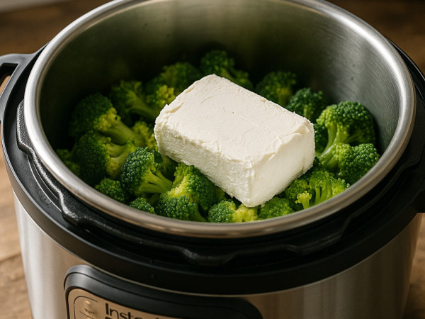 Ad water, broccoli, green onions, cream cheese, butter, salt, and pepper to your Instant Pot. Close the lid and make sure it’s locked. Set it to high pressure and cook for just 1 minute. It will take about 10 minutes for the pressure to build up before the timer starts.
