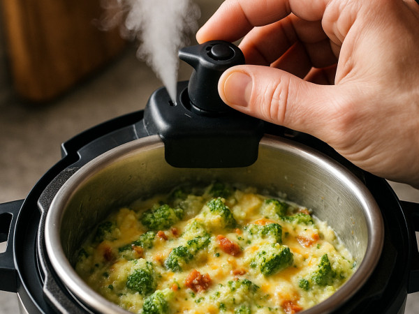 When the cooking time is up, carefully release the pressure using the quick-release method—this should take around 5 minutes. Once it’s safe to open, remove the lid.