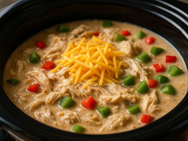 Once the chicken is cooked through, take it out and shred it with two forks. Toss the shredded chicken back into the slow cooker, then stir in the pepper jack and Monterey jack cheeses along with the chopped bell pepper. Put the lid back on and cook for another 30 to 45 minutes, or until the peppers soften and the cheese melts into the chili.