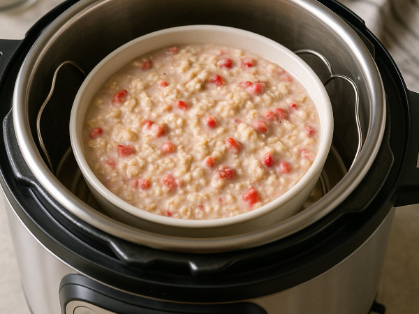 Pour water into your Instant Pot and placing the elevated trivet inside. In a small bowl, combine the milk, oats, freeze-dried strawberries, cream, cinnamon sugar, and a pinch of salt. Give everything a good stir, then set the bowl on the trivet inside the pot. Lock the lid in place and choose the Porridge setting, setting the timer for 5 minutes. It will take about 10 to 15 minutes for the pressure to build up before the cooking begins. Once the cooking cycle is done, carefully use the quick-release method to let out the steam. When it’s safe to open, remove the lid and top your oatmeal with some fresh strawberries for a nice, fresh touch. Enjoy!