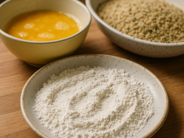 Spread the flour out on a large plate. Crack the eggs into a shallow bowl and give them a good whisk. In another shallow dish, mix together the bread crumbs with garlic powder, paprika, cayenne, black pepper, chili powder, and a pinch of salt.