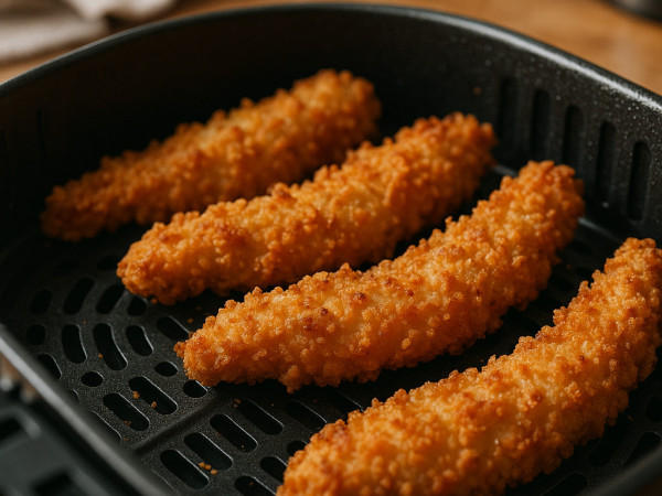 In a shallow bowl, beat together the egg with a pinch of salt and pepper until everything is well mixed. In another bowl, combine the cornbread crumbs, panko, honey powder, and poultry seasoning. Dip each chicken strip into the egg mixture, letting any extra drip off, then coat it thoroughly in the cornbread crumb mixture. Heat your air fryer to 380°F (190°C). Arrange the chicken strips in a single layer inside the basket and cook for about 6 minutes. Flip them over and cook for another 6 minutes, until they’re golden and crispy. Let them cool for a minute before digging in!