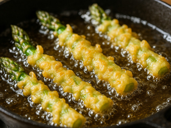 Heat about an inch or two of oil in a deep pan over medium-high heat. While the oil warms up, mix the tempura batter with water until it’s nice and loose. Trim off the tough ends of the asparagus, then dip each spear into the batter, making sure they’re fully coated. Carefully lower a handful of asparagus into the hot oil—about five or six at a time—and fry them until they float to the surface, which should take around 30 seconds to a minute. Once they’re golden and crispy, transfer them to paper towels to drain any excess oil. Sprinkle with a bit of sea salt while they’re still warm, then repeat with the rest. Enjoy them fresh and crispy!