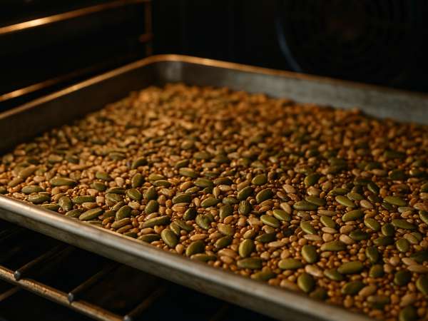 Spread the seed mixture out in a single layer on your prepared baking sheet. Pop it in the oven and bake for 10 minutes, then take it out and stir things around. Put it back in for another 5 minutes, stirring again afterward. Keep an eye on the egusi seeds—they’re the first to show they’re roasting by turning brown. Bake for about 5 more minutes, checking after 3 minutes without opening the oven door. Once those egusi seeds are brown and the pepitas start to get glossy and puff up, turn off the oven and crack the door open. Let the seeds hang out in the cooling oven for about 10 minutes.
