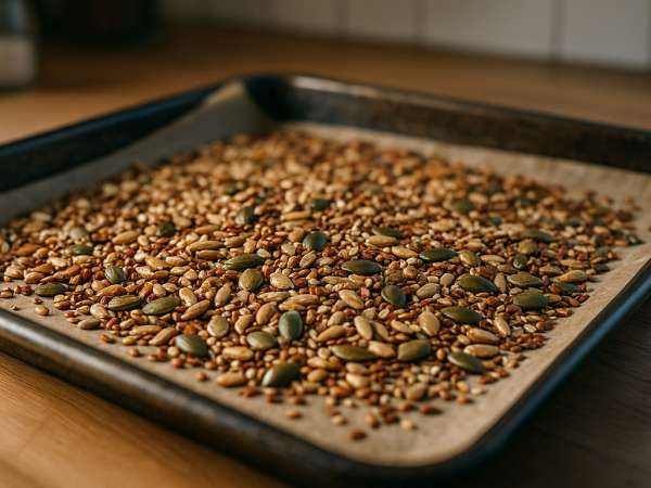 Heat your oven to 375°F (190°C) and line a large baking sheet with parchment paper—this will make transferring the seeds later so much easier. In a big bowl, toss together all your seeds: pepitas, sunflower, flax, egusi, chia, quinoa, white and black sesame, plus amaranth. Drizzle about a tablespoon of olive oil over them while stirring to coat, then add the rest of the oil bit by bit as you keep mixing. Sprinkle in some salt, cayenne, and ground pepper to taste, and give everything a good mix so the seasoning is evenly spread.