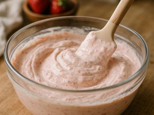 - Gently fold in the strawberries to avoid breaking them and keep the cake airy.