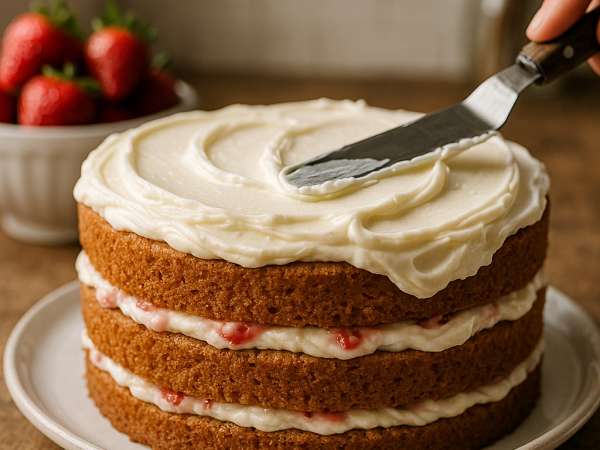 To assemble, start with one of the pink layers on your cake plate and spread half the strawberry filling over it. Add the plain cake layer next, top it with the remaining filling, and finish with the second pink layer. Whip together heavy cream, powdered sugar, and vanilla until thick enough to spread, then cover the entire cake with this frosting. For a smooth finish, place a piece of parchment paper on top and run a spatula over it, then peel the paper off.