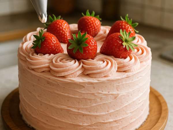 Finally, pipe swirls of frosting around the edge of the cake and top each with a whole strawberry for a pretty finishing touch. Enjoy!