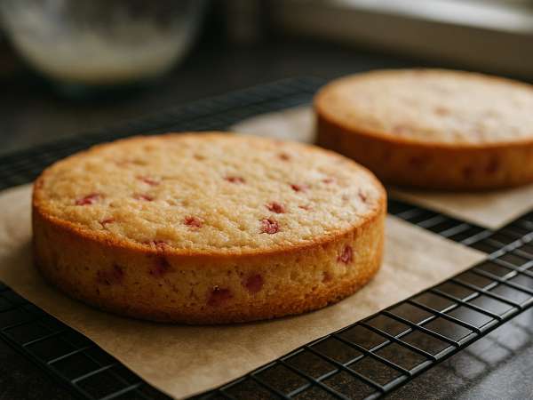Bake the cakes for 15 to 20 minutes until a toothpick inserted in the center comes out clean. Once baked, carefully flip them out onto a wire rack lined with parchment paper to cool completely. While the cakes cool, set aside 9 to 12 whole strawberries for decorating, and chop the rest. Give the chopped berries a little pat with a paper towel to soak up any extra juice.