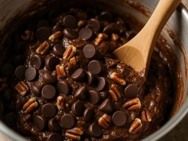 Gently fold the egg whites and vanilla into the dry ingredients; the batter will be quite thick. Then stir in the bittersweet chocolate chips and the toasted pecans until everything is nicely combined.