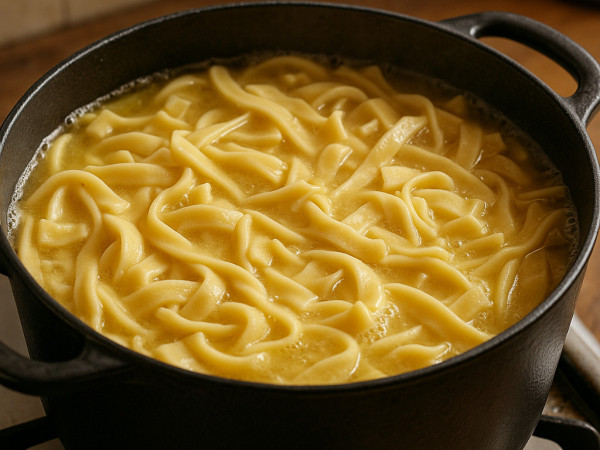 When you’re ready to cook, bring a large pot of chicken broth to a boil. Add the noodles and cook them uncovered for 15 to 20 minutes, or until they’re tender and the broth has thickened nicely. Enjoy!