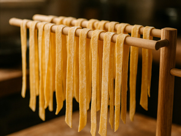 Once the dough has rested, stack the sheets on top of each other and slice them into noodles. Spread the noodles out and let them air dry for about three hours.