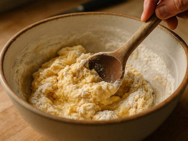 Whisk together the eggs, egg yolks, water, and salt in a bowl until everything is well combined. Gradually beat in 2 cups of flour, then stir in another cup with a wooden spoon. Keep adding flour little by little until the dough gets thick enough that it’s tough to stir. Divide the dough into four equal portions.
