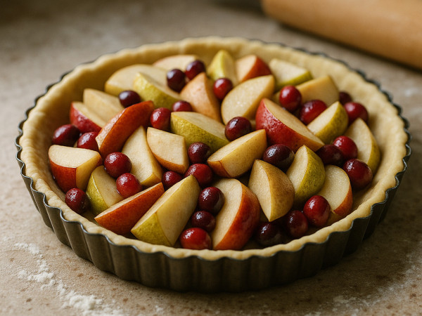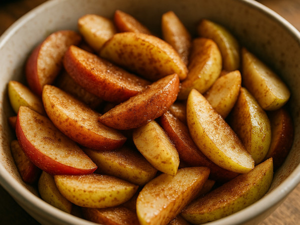 While the dough chills, toss the sliced apples and pear with the orange juice. In a separate bowl, mix the brown sugar, cinnamon, nutmeg, cardamom, and cornstarch. Stir this spice-sugar mixture into the fruit until everything is nicely coated, then set it aside.