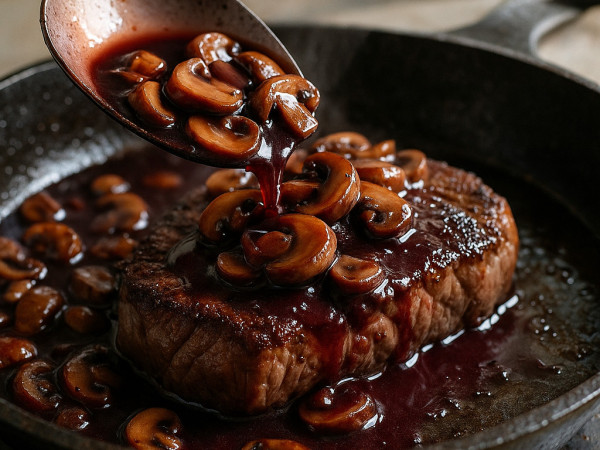 Turn the heat to low and season the sauce with salt, pepper, and most of the remaining parsley. Pour in the red wine and give it a good stir. Meanwhile, heat some olive oil in a separate skillet over medium-high heat and sauté the mushrooms until they’re tender, about 5 minutes. Stir the mushrooms into the sauce, then spoon it over your steaks and sprinkle with the rest of the parsley to finish.